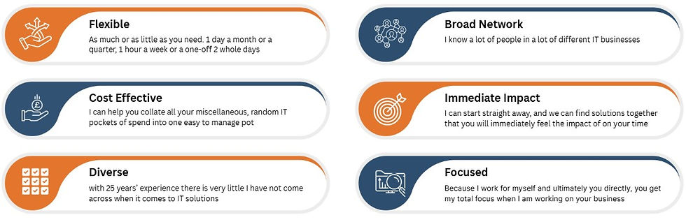 I can help you in a number of areas, whether it's building your in-house IT team, reviewing your technology landscape, ensuring compliance or protecting company data"